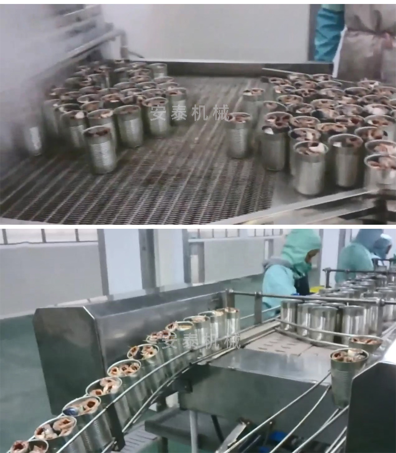 解凍——切斷——清洗——裝罐——蒸煮——加湯汁——真空封罐——高溫殺菌——裝卸籠——實(shí)罐清洗——吹干——貼標(biāo)——裝箱——碼垛
