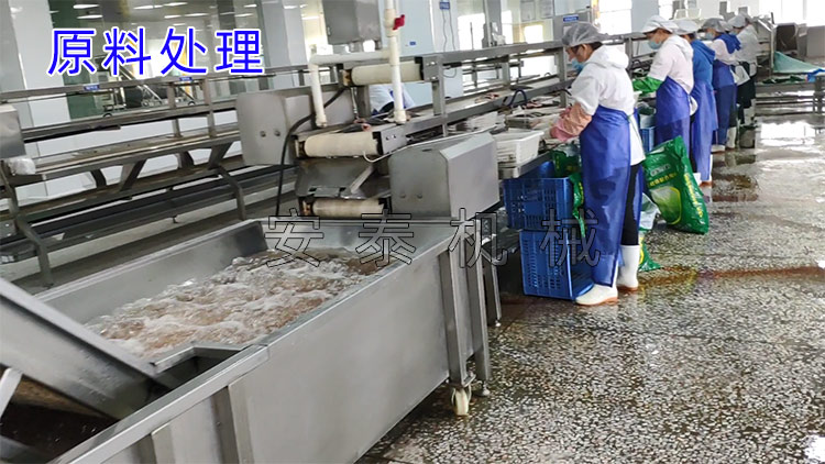 解凍——去頭和內(nèi)臟——清洗——蒸煮——冷卻——去皮和骨——切塊——裝罐——罐湯——封罐——洗罐——裝籠——殺菌——卸籠——洗罐——吹干——噴碼——拆箱——裝箱——碼垛