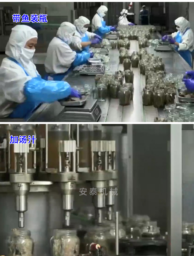 解凍——切斷——清洗——裝罐——蒸煮——加湯汁——真空封罐——高溫殺菌——裝卸籠——實(shí)罐清洗——吹干——貼標(biāo)——裝箱——碼垛